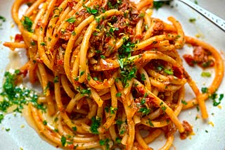 Supersize Me! Caramelised onion, tuna and sundried tomato bucatini